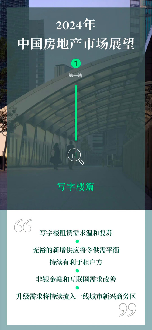 我們將分四篇發布《2024年中國房地產市場展望》報告的主要發現,逐篇分析寫字樓、倉儲物流、零售物業、物業投資等板塊的發展趨勢和機遇。