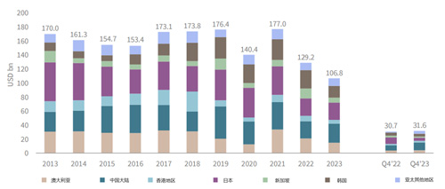 亞太區各主要市場2013-2023年商業地產投資額(單位:十億美元)