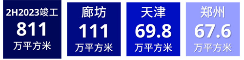 2023年下半年竣工面積最大的城市為廊坊,達111萬平方米,天津和鄭州均有將近70萬平方米的新增供應入市。此外,蘇州、太倉、濟南和東莞也都在這半年內,迎來了超過50萬平方米的新增供應。