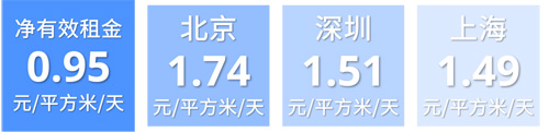 市場平均租金為人民幣0.95元/平方米/天。北京、深圳和上海的凈有效租金位列前三,另有東莞以1.48元/平方米/天僅次于上海,這幾個城市租金顯著高于其他城市。