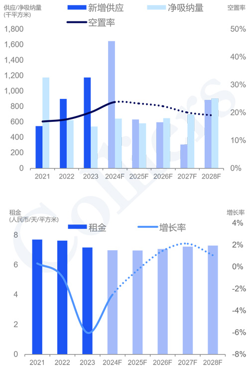 預計2024年,上海辦公樓市場將有近164.8萬平方米的新增供應入市,在此期間租金將繼續承壓。預計至2025年末,隨著供應量的下降以及市場需求的逐步回暖,租金將開啟溫和回升通道。