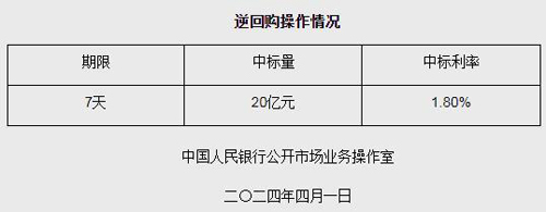 4月1日電 據中國人民銀行網站消息,為維護銀行體系流動性合理充裕,2024年4月1日人民銀行以利率招標方式開展了20億元逆回購操作。