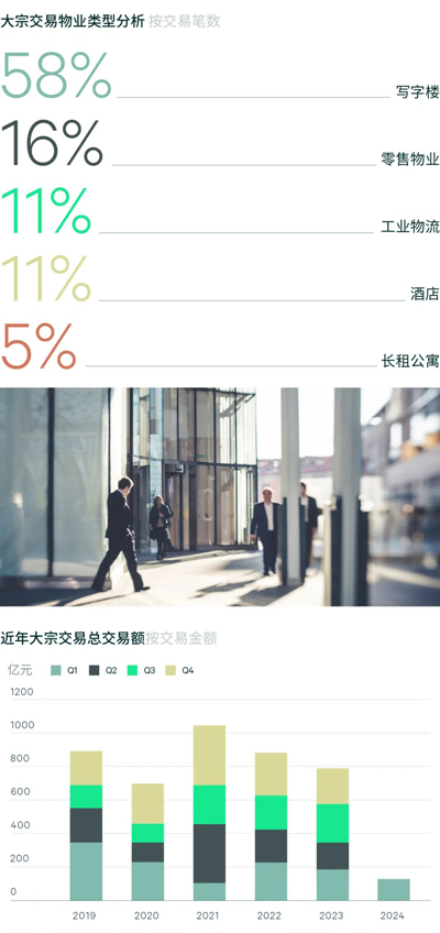 標的物業類型方面,按交易筆數統計,58%的交易集中在商辦寫字樓物業。觀察季內寫字樓投資偏好,濱江板塊依然受到自用買家的青睞,金融機構展現強勁購買力收購大體量獨棟物業的同時,來自外地的制造及交通行業相關企業持續看好上海的營商環境以擇機布局優質資產。此外,企業買家購置投資屬性物業的交易仍時有發生,季內錄得多筆寫字樓整層交易。另一方面,零售物業投資活躍度依舊,如領展完成七寶萬科廣場的余下股權收購,裙房及商鋪型物業亦錄得成交。酒店及公寓類資產吸引力持續,工業物流資產則集中為法拍交易。