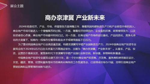 為了推動京津冀商業(yè)地產行業(yè)新質生產力發(fā)展,推進京津冀商業(yè)地產市場生態(tài)構建,第二十屆EXPO COSS中國商業(yè)地產投資專業(yè)展覽會(EXPO COSS2024)將于6月25日在北京富力萬麗酒店舉辦,主題為“商辦京津冀,產業(yè)新未來”。從需求、產品、投資、運營四個維度出發(fā),聚焦京津冀協(xié)同發(fā)展十年背景下寫字樓產業(yè)園的新空間、新場景、新科技、新服務……