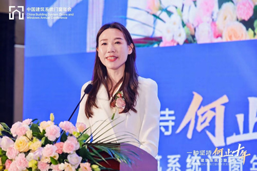 首先,全聯房地產節能門窗分會副會長、興三星云科技股份有限公司副總經理孫紅群致辭,做了《聯心·攜手·致遠》的主題演講,介紹了企業在創新方面的探索和收獲,呼吁大家攜手共進,共同推動系統門窗行業的高質量發展。