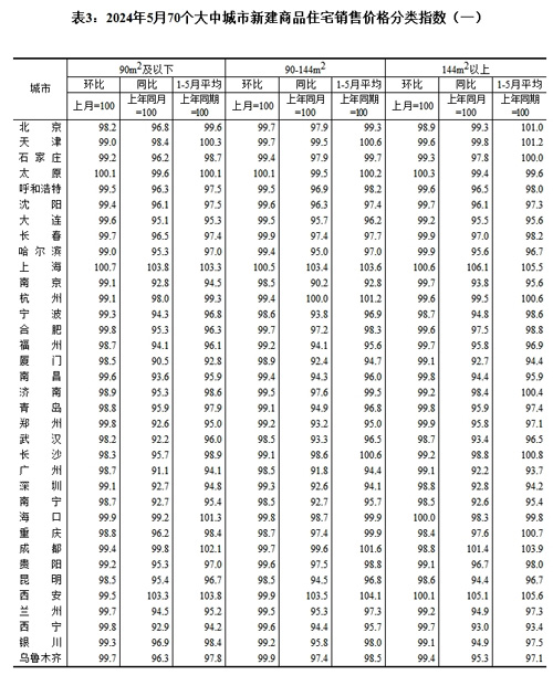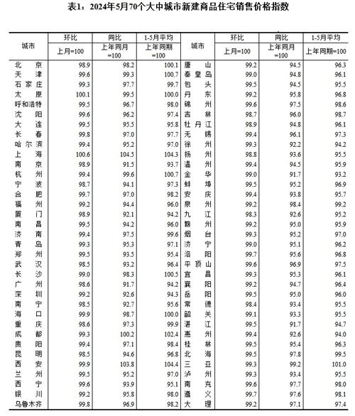 [提要]2024年5月份70個大中城市商品住宅銷售價格變動情況