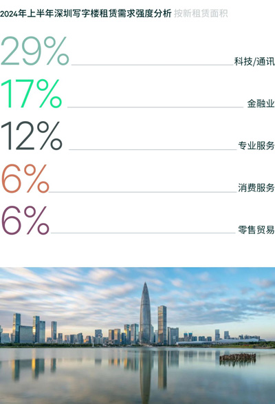 需求結(jié)構(gòu)方面,科技新賽道產(chǎn)業(yè)發(fā)展助推科技板塊重返需求榜首,金融需求則保持穩(wěn)定。二季度科技需求占比環(huán)比提升4.7個(gè)百分點(diǎn)至30.7%,主要分布在前海和高新園,主要貢獻(xiàn)自以人工智能、云計(jì)算及應(yīng)用、智能設(shè)備為主的軟件系統(tǒng)開發(fā)及頭部企業(yè)引領(lǐng)的跨境電商,金融業(yè)以17.4%的占比位列需求第二位。2024年上半年科技板塊同樣為第一大需求,占比為28.5%,錄得了數(shù)宗上萬平方米的超大型租賃成交。金融排名需求第二位,占比為17.6%,傳統(tǒng)金融和其他金融服務(wù)各占半壁江山,其中傳統(tǒng)金融細(xì)分主要聚焦于保險(xiǎn)、基金和證劵細(xì)分板塊,而其他金融服務(wù)6成以上來自投資理財(cái)類企業(yè)。專業(yè)服務(wù)為第三大需求,主要來自法律和咨詢行業(yè),其中咨詢以企業(yè)管理類為主導(dǎo)。