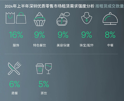需求細(xì)分業(yè)態(tài)表現(xiàn)主要體現(xiàn)在以下幾個(gè)方面:首先,餐飲類需求熱度持續(xù)走高但內(nèi)部品牌迭代有所不同。上半年餐飲需求占比超4成,同比提升4個(gè)百分點(diǎn)。特色餐飲比重不斷加大,單品創(chuàng)新加快,除了傳統(tǒng)的椰子雞和酸菜魚以外,新加入啫啫煲。中餐需求較為穩(wěn)定,以潮汕菜和客家菜新開為主。茶飲和簡餐的需求同比變化不大。但受制于經(jīng)濟(jì)放緩導(dǎo)致商務(wù)宴請的減少,高端餐飲及大餐飲經(jīng)營表現(xiàn)不佳。其次,服飾和珠寶類需求相對穩(wěn)定,分別占比16.0%和9.0%,與去年同期相差無幾。服飾品牌的擴(kuò)張更多來自核心區(qū)域優(yōu)質(zhì)購物中心主動的租戶調(diào)整。一類為提升購物中心競爭差異度的國外首入品牌,一類為快速擴(kuò)張的連鎖品牌。法國服裝品牌American Vintage與日本優(yōu)衣庫姐妹品牌GU分別在萬象天地和領(lǐng)展中心城開出了深圳首店。與此同時(shí),國內(nèi)一線品牌波司登和太平鳥亦在季內(nèi)錄得了多店齊開。此外,汽車品牌在購物中心的拓店積極性明顯下降,同比下降1.5個(gè)百分點(diǎn),僅錄得5家店鋪新開。值得一提的是悅己經(jīng)濟(jì)帶動美容健身類品牌活躍擴(kuò)張,類型涵蓋按摩、美容、美護(hù)發(fā)、美睫、采耳和健身,如絲域養(yǎng)發(fā)、洗臉貓等,此外香港健身品牌24/7fitness也于年初進(jìn)入深圳市場。