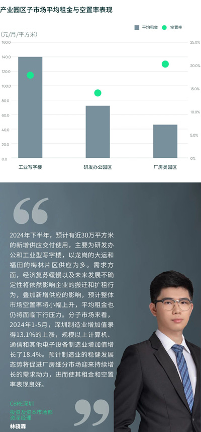 2024年第二季度共錄得三個(gè)項(xiàng)目共計(jì)16萬平方米的新增供應(yīng)入市,包括2個(gè)工業(yè)型寫字樓和1個(gè)廠房,新項(xiàng)目分別為位于蛇口、前海和觀瀾,單季吸納量僅錄得6.2萬平方米,環(huán)比走弱。但2024年上半年整體市場凈吸納量共計(jì)18.8萬平方米,同比增長171.7%,需求有所回升。整體市場空置率受新項(xiàng)目入市及個(gè)別項(xiàng)目的退租影響,半年度上升1.5個(gè)百分點(diǎn)至15.9%。