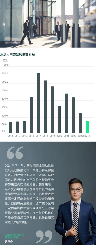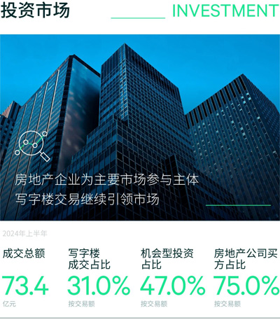 2024年二季度共錄得3宗成交,分別為一宗寫字樓、一宗工業(yè)和一宗購物中心,成交總額為30.2億元,同比及環(huán)比均下跌3成左右。其中寫字樓貢獻(xiàn)了單季62.5%的成交額,為主要交易來源,且三宗交易均以資產(chǎn)交易的形式達(dá)成。2024年上半年總成交金額73.4億元,同比基本持平,寫字樓同樣以31%的交易額占比位居各類交易之首。上半年還罕見錄得一宗購物中心的購買,物業(yè)位于核心拓展區(qū)且經(jīng)營收入穩(wěn)定增長,并采用了售后回租的交易方式。