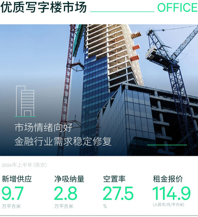2024年上半年,南京寫字樓市場迎來一個新增供應入市,位于新街口板塊的金陵中環(huán)一座,項目體量約9.7萬平方米。二季度市場情緒稍有好轉,對于優(yōu)質項目的問詢量相對回暖,季內(nèi)錄得凈吸納量1.7萬平方米,環(huán)比上升58%,上半年累計為2.8萬平方米,較去年同期下降45.2%。受新增供應影響,空置率環(huán)比上升1.7個百分點,而由于同板塊老舊項目轉性調整,全市空置率較去年年底大體持平。