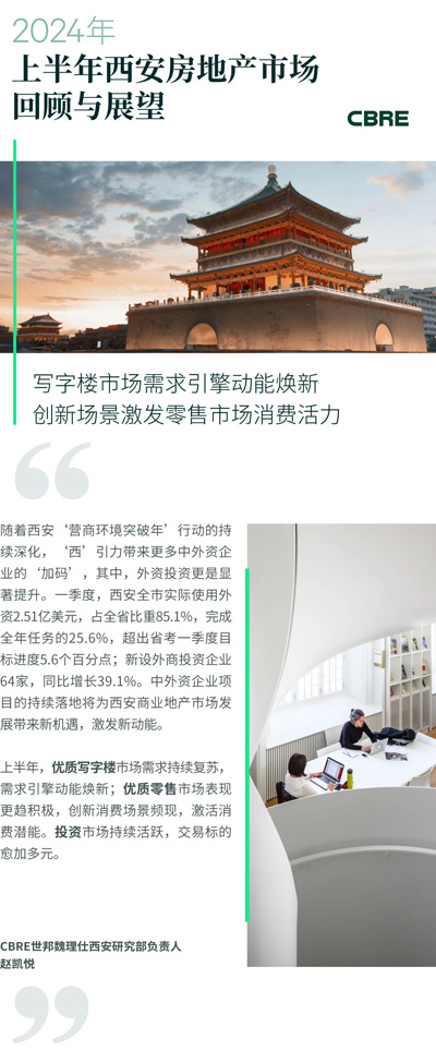 中資企業擴容提質驅動市場需求復蘇。上半年,非本地中資企業新增租賃需求占比半年環比上升11.1個百分點,至65.1%。其中,來自中資企業的升級需求占比52.2%。隨著企業的發展,部分較早進入西安的中資企業因辦公地點選址過時或自有總部翻新而衍生出對辦公環境升級的需求,繼而推動中資企業在甲級樓宇中升級需求的釋放。同時,隨著優質中資企業數量和規模的擴大,新設立及擴租需求占比持續增加,上半年占比近43%。