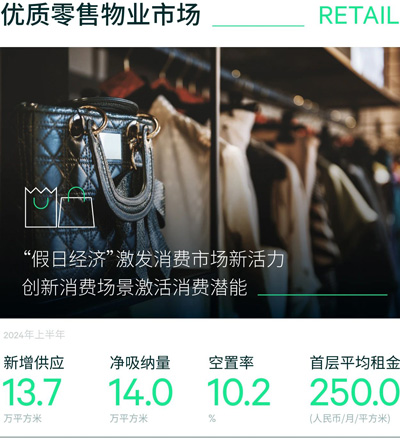 2024年上半年,西安零售物業市場錄得一個項目——位于高新片區的宜家薈聚購物中心新開入市,帶來13.7萬平方米的新增供應,推動整體市場體量上升至691.3萬平方米。在新開項目以接近滿租入市的強勁吸納帶動下,上半年西安零售市場凈吸納量錄得14.0萬平方米,較去年下半年增加近1倍。整體市場空置率半年環比下降0.3個百分點,至10.2%。租金方面,雖市場吸納有所復蘇,但在核心商圈部分項目及社區零售項目租戶持續流失的影響下,整體市場租金仍處下行通道,半年環比下降1.5%,至每月每平方米250.0元。
