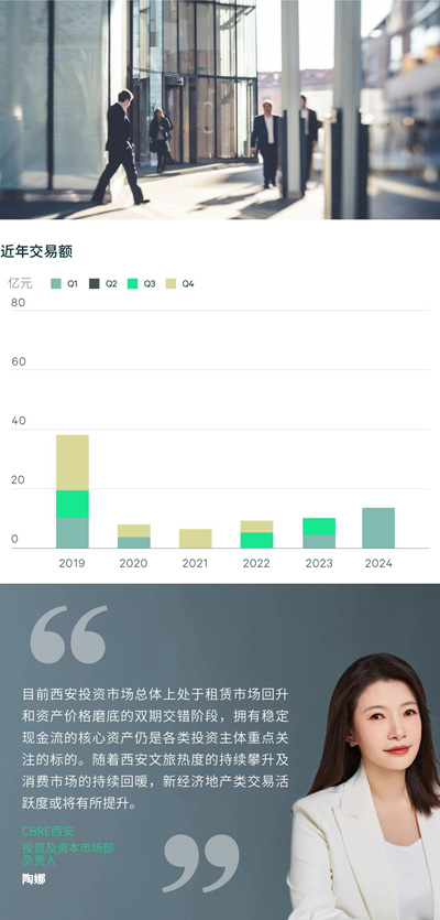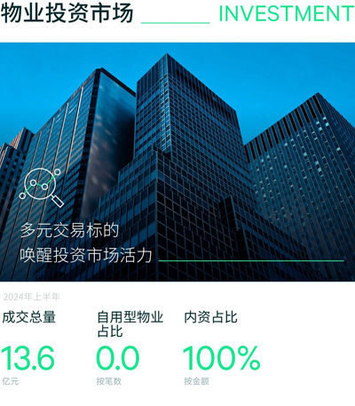 2024年上半年西安大宗交易市場共錄得3筆大宗成交,已知交易額達13.6億元。成交交易標的為一宗酒店、一宗商業樓宇及一宗物流園項目,均為資產交易,市場交易標的資產類型更趨多元。目前來看,“買方與賣方的預期差”仍是推進大宗物業交易的難點之一,租賃和金融市場的不確定預期令投資者對資產價格的重新錨定尚存較大分歧。在物業收購類型層面,雖寫字樓類型項目仍是占比最大的待售項目類型,受益于消費場景和旅游出行的加速升溫,零售物業和酒店的關注度也持續走高,西安市場上此類型標的數量也持續增加。分投資者類型來看,目前西安市場仍以個人買家最為活躍,同時,政府下設平臺公司、城市更新基金等機構的投資意愿持續上升。多元化的標的類型及投資意愿的增加或將共同促進西安投資市場更趨活躍。
