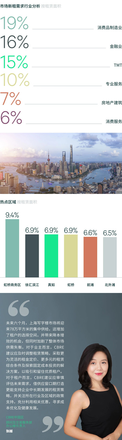 區(qū)位表現(xiàn)來看,虹橋商務(wù)區(qū)受多家汽車企業(yè)搬遷需求帶動(dòng),租賃活躍度較往年明顯提升;徐匯濱江子市場中,消費(fèi)服務(wù)業(yè)(教育)為需求主力;真如子市場去化表現(xiàn)穩(wěn)定,TMT相對活躍;虹橋子市場需求穩(wěn)中有升,主要來自消費(fèi)品制造業(yè)及電商;前灘子市場去化則主要來自金融業(yè)及工業(yè)制造業(yè)企業(yè)的大面積成交。