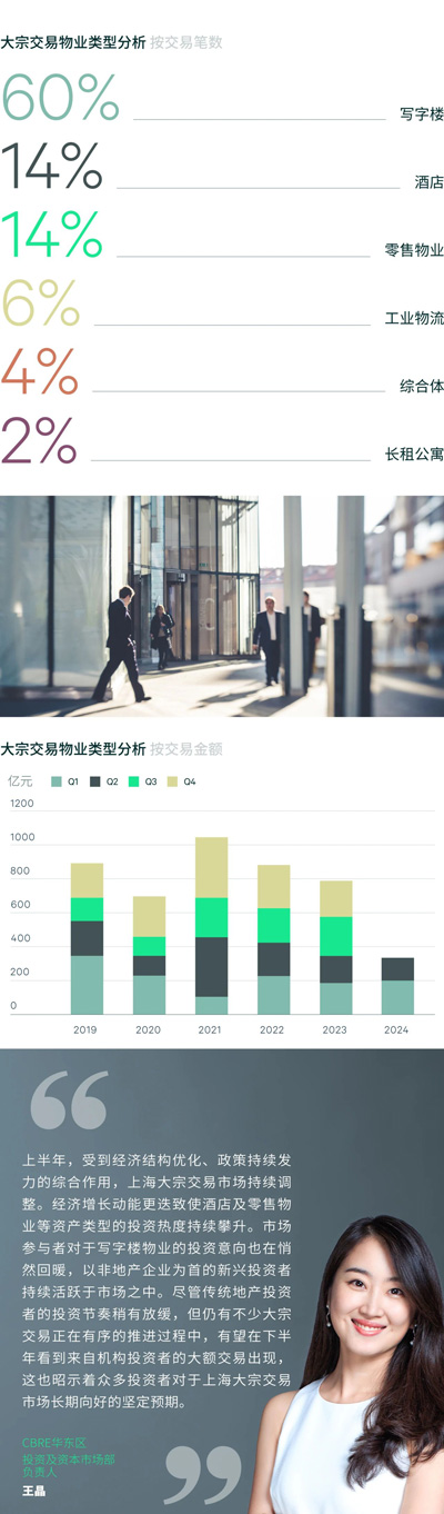 2024年上半年,上海物業投資市場錄得50筆交易,交易金額共計323.3億元,較去年同期水平微降6.6%。市場情緒仍在緩慢修復,資產價格步入磨底階段,物業投資表現逐步分化,核心資產投資吸引力愈發凸顯,上半年錄得約12%的交易位于陸家嘴、南京西路等傳統核心商務區。