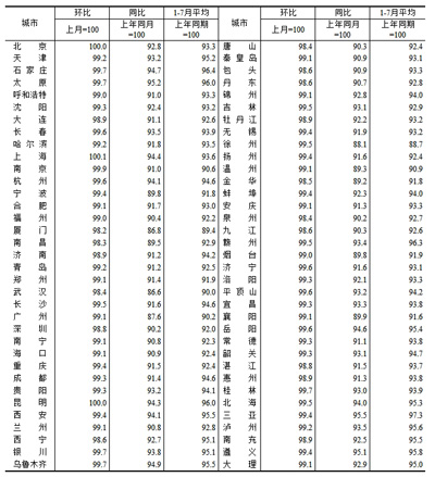 表1:2024年7月70個大中城市新建商品住宅銷售價格指數