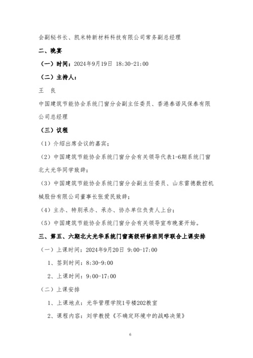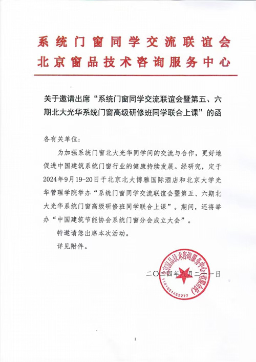 [提要]為加強系統門窗北大光華同學間的交流與合作,更好地促進中國建筑系統門窗行業的健康持續發展。經研究,定于2024年9月19-20日于北京北大博雅國際酒店和北京大學光華管理學院舉辦“系統門窗同學交流聯誼會暨第五、六期北大光華系統門窗高級研修班同學聯合上課”。