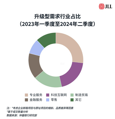 各行各業(yè)均體現(xiàn)出辦公環(huán)境升級(jí)的訴求。以交易數(shù)量來(lái)看,在所有升級(jí)案例中,專業(yè)服務(wù)業(yè)的成交數(shù)量占比達(dá)27%,體現(xiàn)出該行業(yè)更加靈活的租賃決策,其中,律師事務(wù)所的升級(jí)需求尤為顯著。在2023年第一季度至2024年第二季度的律所搬遷案例中,升級(jí)型需求超過(guò)95%。科技互聯(lián)網(wǎng)和制造貿(mào)易類企業(yè)位居其后,當(dāng)前的市場(chǎng)環(huán)境提供了大量與該行業(yè)租金承付范圍較匹配的優(yōu)質(zhì)新近竣工項(xiàng)目,鼓勵(lì)此類租戶在優(yōu)先成本考量前提下,尋找到適合的升級(jí)機(jī)會(huì)。金融服務(wù)企業(yè)就其搬遷總量而言,升級(jí)型需求相對(duì)有限,主要原因在于大多數(shù)金融類租戶的原址品質(zhì)較高,而該行業(yè)代表性搬遷對(duì)區(qū)位的粘性較為明顯,尤其是銀行、保險(xiǎn)等傳統(tǒng)金融企業(yè)。