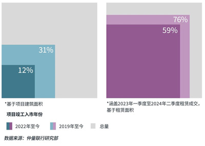2019年至2024年上半年,上海全市累計(jì)新增甲級(jí)辦公樓面積達(dá)547萬(wàn)平方米,占整體甲級(jí)辦公樓市場(chǎng)總存量的31%。大量新項(xiàng)目的竣工入市帶動(dòng)辦公樓市場(chǎng)品質(zhì)提升,也給企業(yè)帶來(lái)更多搬遷選擇。僅觀測(cè)過(guò)去一年半的升級(jí)類成交,59%企業(yè)選址于2022年以后竣工的項(xiàng)目,約3/4的企業(yè)搬遷至2019年后竣工項(xiàng)目。