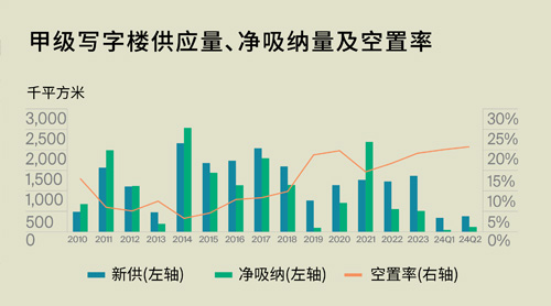 第二季度上海甲級寫字樓市場共有六個新項目竣工交付,為市場帶來383,356平方米的新供面積。2024年上半年的市場新供達到725,155平方米,同比增長39%。第二季度,有超過55%的市場新供位于新興商務區市場,包括位于浦東后世博的世博天地V1&V2、浦西徐匯濱江的源點大廈,以及浦西楊浦濱江的中交濱江廣場。核心商務區市場亦有新項目竣工交付,位于淮海中路商務區的太平洋新天地商業中心2號樓為市場帶來30,098平方米的辦公面積。此外,位于靜安區的由吉寶置業開發的吉寶靜安中心也在本季度竣工交付。
