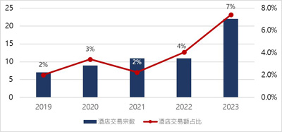 2019年-2023年酒店業態大宗交易宗數及交易額占比
