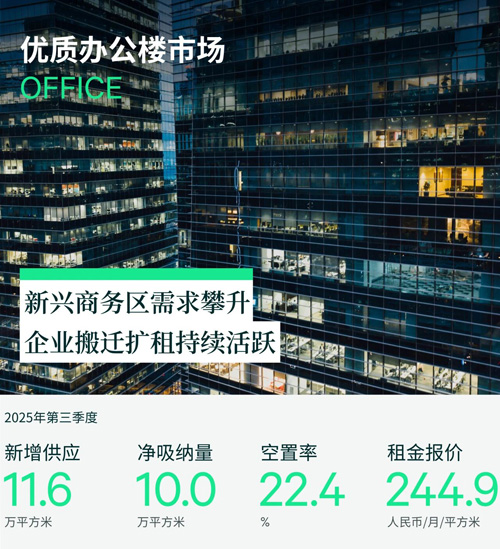 本季度市場延續上季度緩步復蘇態勢,凈吸納量環比微升6.7%至10.0萬平方米。前三季度累計凈吸納量達27萬平方米,已超越去年全年水平。整體空置率環比微降0.1個百分點至22.4%。