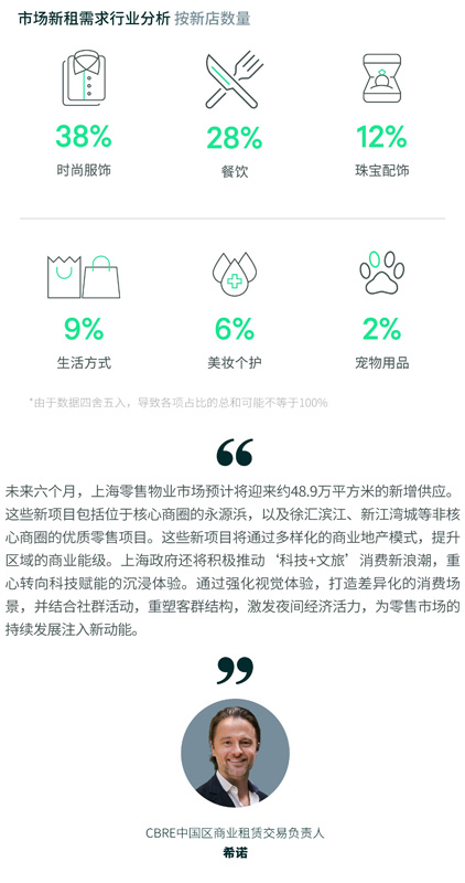 當季,零售品類以68%的占比主導市場需求,其中運動戶外類表現尤為突出,在服飾細分領域(占零售需求38%),品牌升級趨勢顯著。成熟品牌如The North Face在港匯恒隆廣場升級形象,并于新天地東臺里開設高級全品類店,顯示其多層級市場策略。新晉品牌如Popbasic于世紀匯廣場開設中國首店,Oneup中國首店則隨著新天地東臺里一齊亮相。