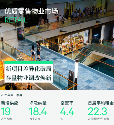 新項(xiàng)目的高入駐率推動(dòng)全市凈吸納量上升至約18.4萬平方米,空置率穩(wěn)定于4.4%。需求的活躍表現(xiàn)支撐租金基本面保持穩(wěn)定,全市商圈首層平均租金環(huán)比微降0.3%至每天每平方米22.3元。