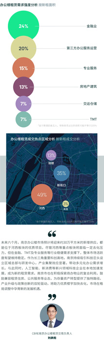 從行業(yè)需求看,金融業(yè)于本季度顯著回暖,以24%的租賃面積占比躍居首位,需求主要來自保險(xiǎn)和證券類企業(yè)的擴(kuò)張與升級(jí)。第三方辦公服務(wù)運(yùn)營商占比20%,位列第二,其中聯(lián)合辦公空間運(yùn)營商表現(xiàn)活躍。專業(yè)服務(wù)業(yè)(15%)及房地產(chǎn)業(yè)(13%)需求穩(wěn)定,TMT行業(yè)占比為7%。板塊活躍度方面,本季度河西板塊依舊領(lǐng)跑市場(chǎng),占比達(dá)49%;新街口位居次席,占比35%。從成交結(jié)構(gòu)看,500平方米以下的中小面積段交易占比高達(dá)69%,凸顯中小企業(yè)仍是市場(chǎng)需求主力。搬遷類交易占據(jù)絕對(duì)主導(dǎo),占比達(dá)81%,升級(jí)搬遷和基于租金性價(jià)比的跨區(qū)域置換是主要?jiǎng)右颉P略O(shè)辦公需求占比17%,主要集中在金融、第三方辦公服務(wù)及消費(fèi)品制造業(yè)。