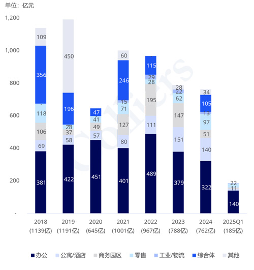 辦公物業(yè)2025年第一季度成交占比最大,主要為中郵保險109億收購博華廣場,這也是近三年唯一單筆超過100億的房地產大宗交易