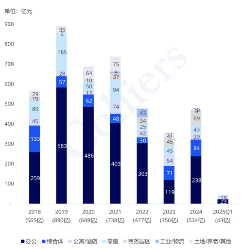 公寓/酒店項目是近些年的投資熱點,2025年第一季度已成交18億元,已是2024年全年成交金額的60%,主要交易為建信住租基金16.83億元收購朝陽區(qū)鯤意熙園項目