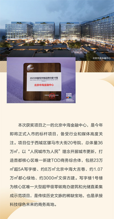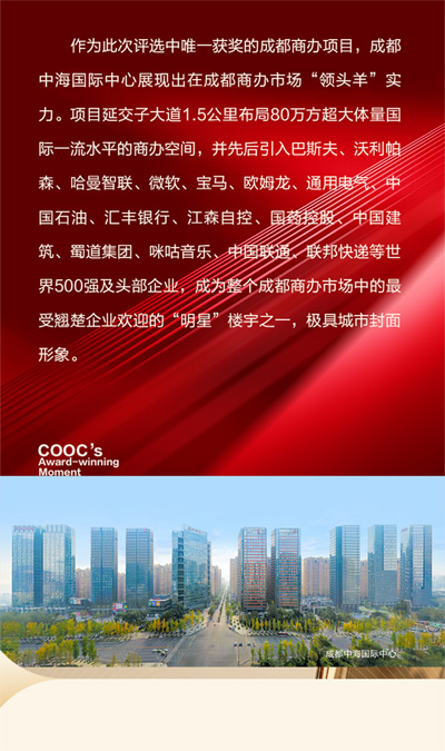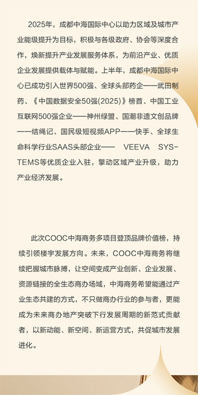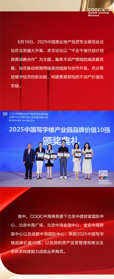 [提要]COOC中海商務旗下北京中建財富國際中心、北京中海廣場、北京中海金融中心、金安中海財富中心以及成都中海國際中心,榮獲2025中國寫字樓品牌價值10強,以優異的資產運營管理和商業生態體系構建能力成就業界典范。