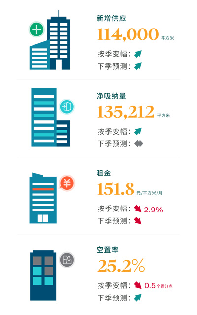 第二季度,深圳甲級寫字樓租賃市場需求如期有序修復。平安信用卡大廈作為本季度唯一新增供應項目,入市體量達11.4萬平方米,供應端保持結構性釋放。與此同時,企業辦公需求顯著回暖,推動全市凈吸納量顯著回升至13.5萬平方米,錄得可觀的環比及同比增幅。得益于凈吸納量的有力支撐,新增供應得以有效消化,全市空置率環比下降0.5個百分點至25.2%,釋放出階段性企穩的積極信號。