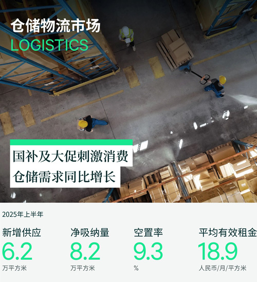 2025年上半年,成都倉儲物流市場錄得深國際溫江園區交付,新增倉儲面積約6.2萬平方米。著眼需求端,凈吸納量錄得約8.2萬平方米,同比顯著增長,帶動全市高標庫整體空置率繼續改善,較去年末下降0.4個百分點至9.3%。市場供需關系逐漸趨向弱平衡,平均有效租金累計跌幅收窄至5.1%,達每月每平方米18.9元。
