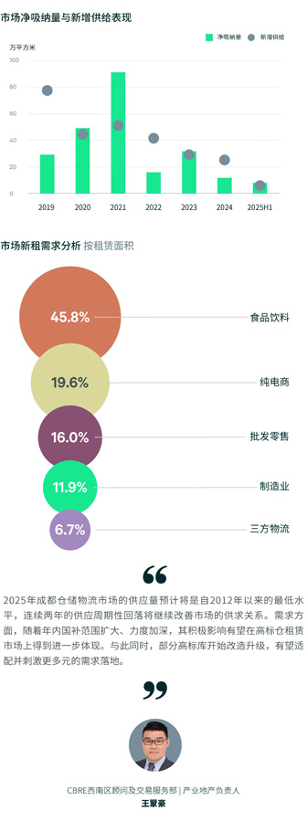 新增需求分行業看,食品飲料、電商、批發零售主導上半年去化,分別占比45.8%、19.6%、16%。分區域看,上半年新津、新都及青白江的活躍度最高,分別錄得新增需求的36.7%、18.5%及16.4%。
