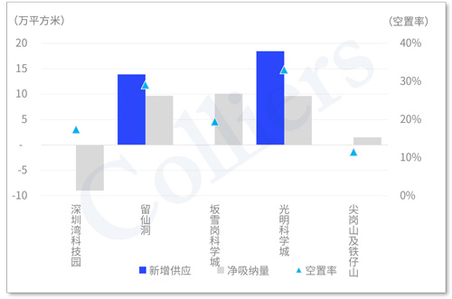 其中坂雪崗科學城、留仙洞在優質項目不斷增加、良好的產業基礎、靈活的租賃策略及總部自用帶動下均實現約10萬平方米的凈吸納量。