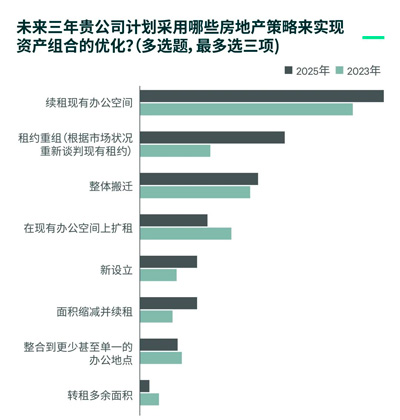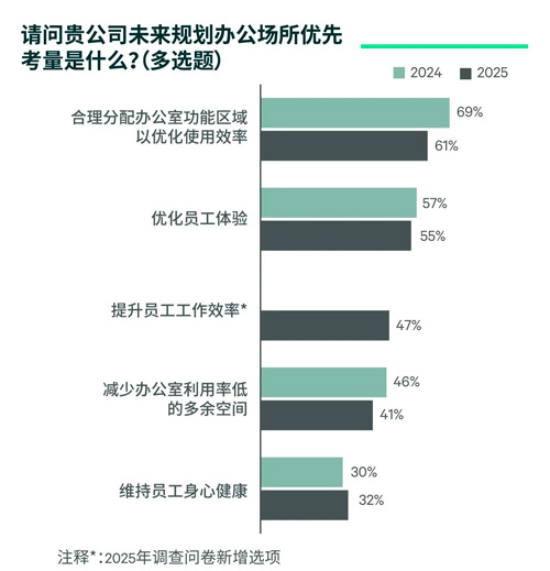 與2024年調(diào)查結(jié)果相比,租戶對空間調(diào)整的需求,即“合理分配辦公室功能區(qū)域”和“減少辦公室利用率低的多余空間”有所降低,我們認(rèn)為這與近年來租戶持續(xù)進(jìn)行空間布局優(yōu)化不無關(guān)系。