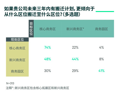 在今年調(diào)查中, 我們詢問了租戶當(dāng)前辦公所在和搬遷意向區(qū)位,從而更好地了解租戶對不同辦公區(qū)位的偏好。