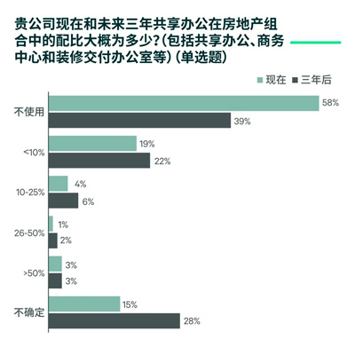 今年的調(diào)查結(jié)果顯示,企業(yè)租用共享辦公的傾向呈上升趨勢:三年后考慮在企業(yè)房地產(chǎn)組合中納入共享辦公的受訪者占比為33%,較當(dāng)前使用共享辦公的企業(yè)占比上升6個百分點(diǎn)。CBRE認(rèn)為,在經(jīng)濟(jì)和業(yè)務(wù)前景尚不完全明朗的情況下,共享辦公是企業(yè)增強(qiáng)房地產(chǎn)規(guī)劃彈性、減少資本開支的有效途徑之一,這一趨勢也與調(diào)查中受訪企業(yè)將“靈活的租約條款”作為重要選址因素的發(fā)現(xiàn)相吻合。但總體來看,共享辦公仍是企業(yè)房地產(chǎn)組合中的補(bǔ)充型選項,僅有11%的受訪企業(yè)預(yù)計三年后共享辦公在其房地產(chǎn)組合中的配比超過10%。