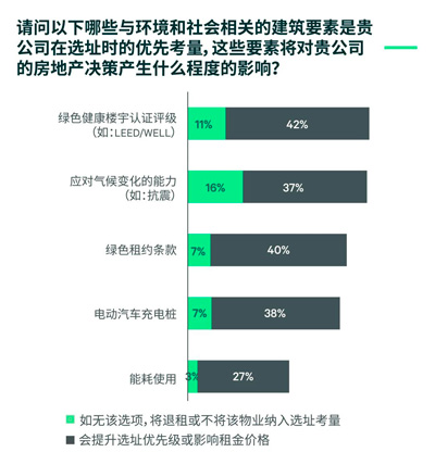 綠色選址考量重要性排名來看,綠色健康樓宇認(rèn)證和樓宇抗災(zāi)能力仍位列前二,被半數(shù)以上租戶認(rèn)為是關(guān)鍵性指標(biāo),綠色租約條款位列第三。