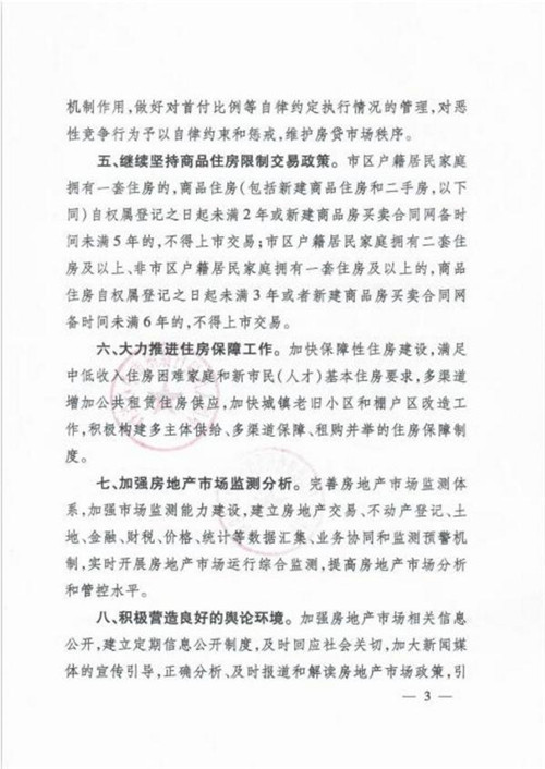 市區戶籍居民家庭擁有二套住房及以上、非市區戶籍居民家庭擁有一套住房及以上的,權屬登記未滿3年或新建商品房買賣合同網備時間未滿6年的,不得上市交易。