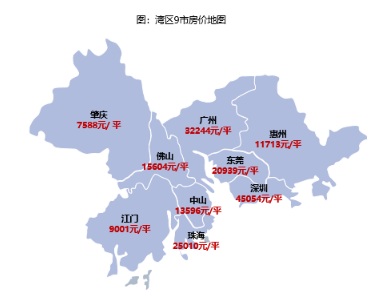 如果從樓市表現上看,9市的房價價差就更大了。灣區9市中,肇慶和江門是唯二房價沒有過萬的城市。同時肇慶也是灣區城市中唯一沒有限購限售政策的城市。