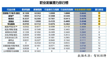 根據(jù)智聯(lián)招聘近3年15大類行業(yè)25189萬在線職位及32354萬投遞行為數(shù)據(jù),《報告》顯示,2020-2025最具發(fā)展?jié)摿Φ奈宕笮袠I(yè)分別為互聯(lián)網(wǎng)/IT/電子/通信、房地產(chǎn)、制造業(yè)、金融業(yè)和專業(yè)服務(wù)。從需求指數(shù)來看,房地產(chǎn)、制造業(yè)、互聯(lián)網(wǎng)行業(yè)人才需求潛力排名前三、從薪酬指數(shù)來看,金融業(yè)、房地產(chǎn)、互聯(lián)網(wǎng)行業(yè)薪酬潛力排名前三、從吸引力指數(shù)來看,互聯(lián)網(wǎng)、制造業(yè)、專業(yè)服務(wù)、批發(fā)/零售/貿(mào)易、房地產(chǎn)行業(yè)吸引力排名前五、從粘性指數(shù)來看,互聯(lián)網(wǎng)、制造業(yè)、房地產(chǎn)行業(yè)粘性排名前三。