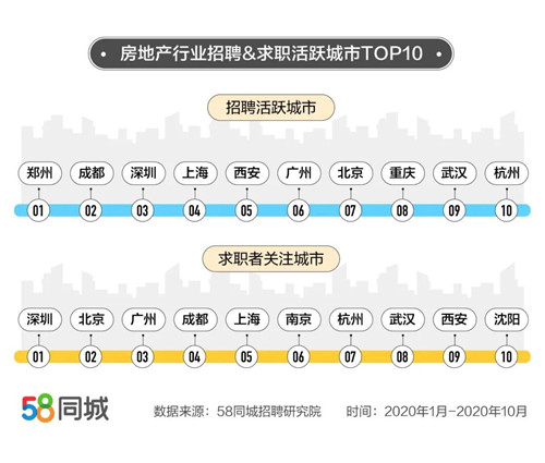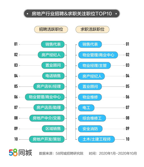 58同城招聘研究院數據顯示,2020年1-10月,房地產業整體求職需求同比上升5.01%。