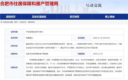 合肥市房管局官網(wǎng)信息顯示,此次互動(dòng)交流來(lái)信時(shí)間在國(guó)家統(tǒng)計(jì)局公布上述報(bào)告之后。對(duì)于建議中提到的“又有大批人在炒作合肥濱湖高新區(qū)的房?jī)r(jià)”,嚴(yán)躍進(jìn)分析稱,實(shí)際上這一波合肥房?jī)r(jià)的炒作,和業(yè)主控價(jià)等行為有關(guān),而這個(gè)現(xiàn)象是此前深圳出現(xiàn)比較早的。過(guò)去的調(diào)控更多是體現(xiàn)為對(duì)房企和中介代理機(jī)構(gòu)的調(diào)控,而對(duì)于業(yè)主控價(jià)的管控比較少,所以后續(xù)調(diào)控也需要把業(yè)主控價(jià)等行為納入監(jiān)管之中,真正促進(jìn)房?jī)r(jià)的穩(wěn)定。