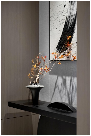 穿過玄關屏風之后,大氣朗闊的客廳空間豁然鋪開。方正有序的格局里,以深色格柵排列表達緊湊感,白淺紋巖板表現疏朗感,節奏清晰分明,進而打破單調界限。整面落地窗更將都市景觀融匯到客廳,帶來自然天際的仰望與現代夜景的璀璨。細鑒每件物品,都涌動著藝術靈性,極具先鋒雕塑感,精奢情調與中式水墨律動兼收并蓄。