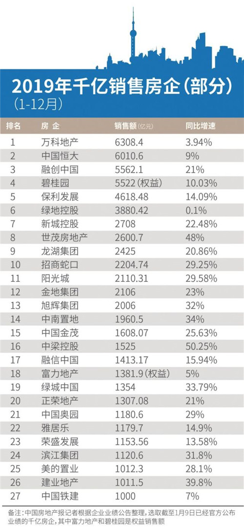 截至目前仍有多家房企未公布其2019年全年業績,中國房地產報記者綜合房企業績公告以及第三方機構的數據測算,2019年房地產行業千億房企將達到34家。