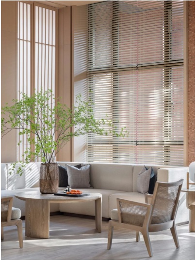 銀杏樹成為中庭部分交流的中心,座椅采用圍合式散落于周圍,使人與空間、人與人之間形成自然地交流與互動。青草綠與白橡木的搭配,宛若夏天午后的清爽。所有的座椅都采用藤編圓弧結構,桌幾加入防灑邊沿小細節,以及貼合身體舒適度的軟靠墊和適宜高度等,貼心處理好家具使用的舒適考究。