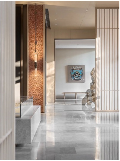 設計借鑒寬窄巷子的人文與哲學,去創造空間寬與窄的圓融,使空間與空間之間,視覺上形成區別又能達成統一。設計最大的亮點在于,非遺物件的植入,以及當代藝術品或以畫或以物而存在,鮮活了空間生命向上的藝術特質。